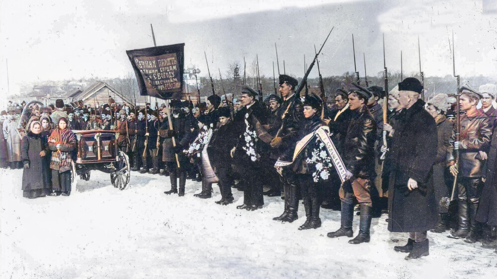 Траурная церемония прощания с большевиками, убитыми кулаками в селе Хвощевка в марте 1918г.