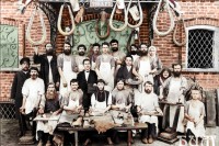 Складские помещения и мастерские Сургутовых находились у Базарной площади села Богородского. Группа рабочих-рукавичников в фартуках изображены на фоне мастерской из красного кирпича с кованой дверью, ставнями и ажурной решеткой в оконном проеме. К ажурному навесу над входом прикреплена вывеска «Складъ рукавичнаго товару». Вокруг нее развешаны рукавицы и хомутины. Во 2-м ряду сидят сыновья хозяина мастерской Сургутова Ивана Федоровича: Иван Иванович держит в руке счеты, Федор Иванович с перьевой ручкой, опирается на круглую консоль. Позади них стоят работники. Фото Лапкина Д.М.