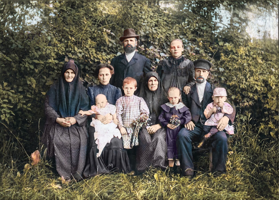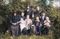 Семья крестьян-кожевников Кукиных, проживавших на ул. Алешковской - ныне улице Кашина, из шести взрослых с четверыми детьми. Надпись на обратной стороне: Кукин Василий Иванович – 34 года отец, Кукина Анна Николаевна – 31 год мать, Кукина Александра – бабушка, Кукина Александра Васильевна – сестра, Кукин Алексей Васильевич – брат, Кукин Михаил Иванович – дядя, Кукин Серафима Андреевна - тетя. Фото сделано в саду дома-усадьбы. Автор неизвестен.