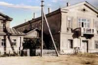 1957 г. Здание в стадии завершающих работ: оштукатурено, но не окрашено, окна в подтеках, у стены стоят деревянные козлы, на земле остатки песка. Автор фото Куницын А.С.