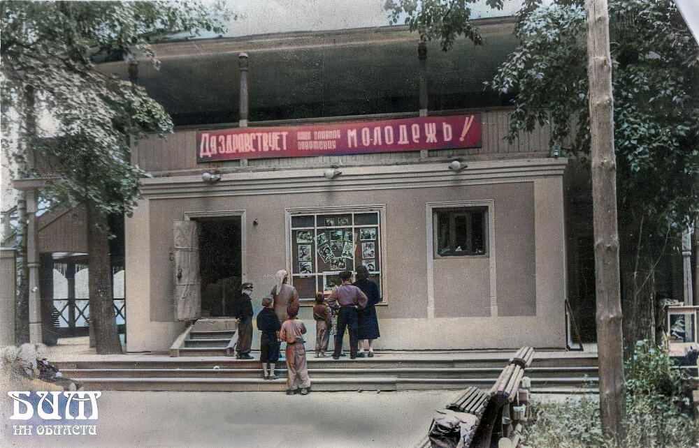 Кинотеатр для демонстрации фильмов в летний период в Старом парке. Кинотеатр был деревянный. Помещение кассы небольшой прямоугольной формы, к которому ведут три деревянные ступени. На фасаде квадратный остекленный стенд для размещения киноафиш с названиями фильмов и портретами артистов. Над ним транспарант с надписью: "Да здравствует наша славная советская молодежь!" Автор фото неизвестен.