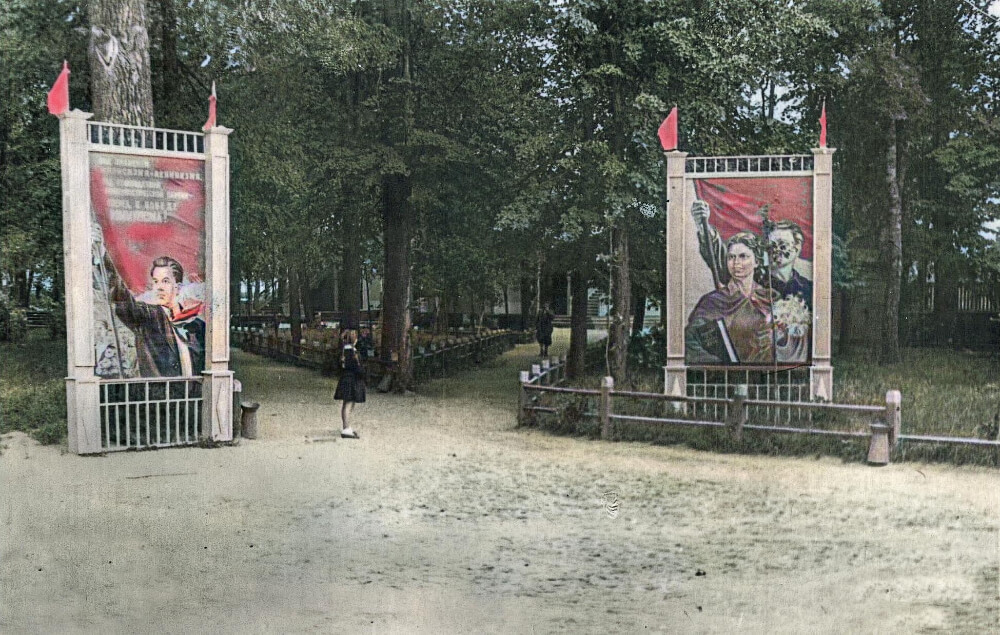 Больших размеров агитационные щиты находились при входе в парк на центральной парковой аллее. Слева агитплакат с изображением юноши в пионерском галстуке со стягом в руках. Сверху цитата, призывающая к свершениям для «победы коммунизма». Справа на агит-плакате девушка-комсомолка с книгой и букетом в руках, за ней юноша со знаменем в руке. На аллее стоит маленькая девочка-первоклассница в школьной форме. Автор фото неизвестен.