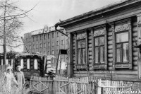 На первом плане справа одноэтажный деревянный дом на три окна с резными наличниками. Перед ним деревянный штакетник. В нем находилась редакция газеты «Ленинская победа». Рядом деревянный дом, крыша и второй этаж которого уже разобраны. За ним видно новое пятиэтажное здание городской администрации.