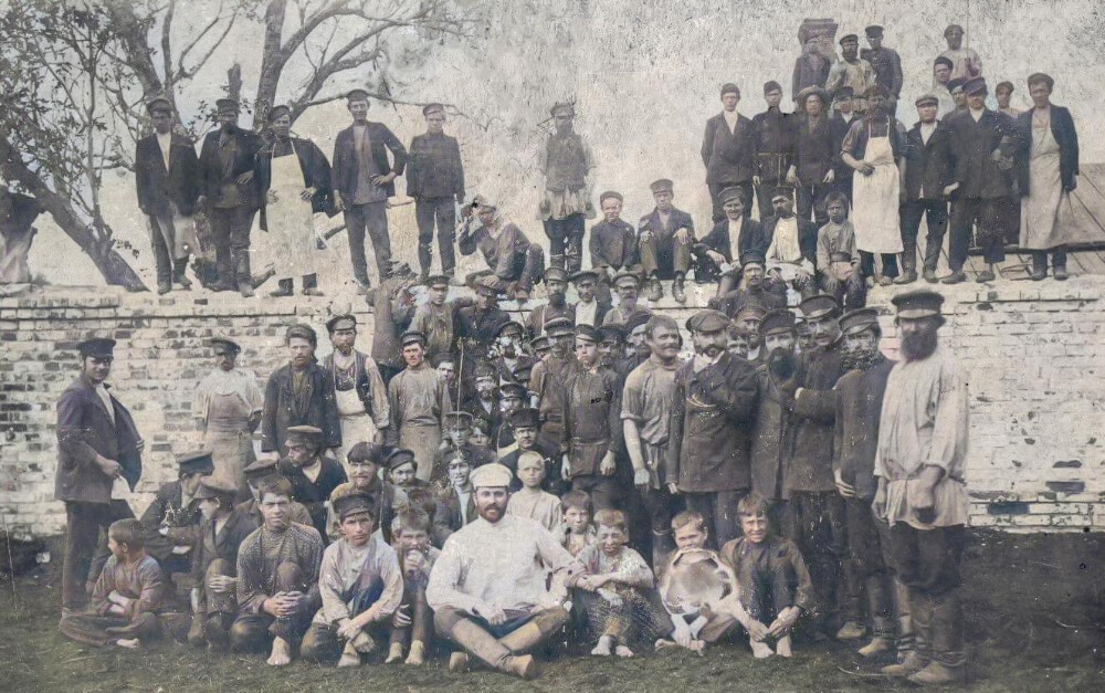 Справа в костюме с двумя рядами цепочек карманных часов, в кепке, рукой касаясь подбородка, стоит заводчик купец I гильдии Иосиф Яковлевич Равкинд. Рабочие-мужчины одеты в спецовки, косоворотки, длинные фартуки и картузы. На стене справа в черной косоворотке с пояском стоит Кулагин Василий. Автор фото неизвестен.