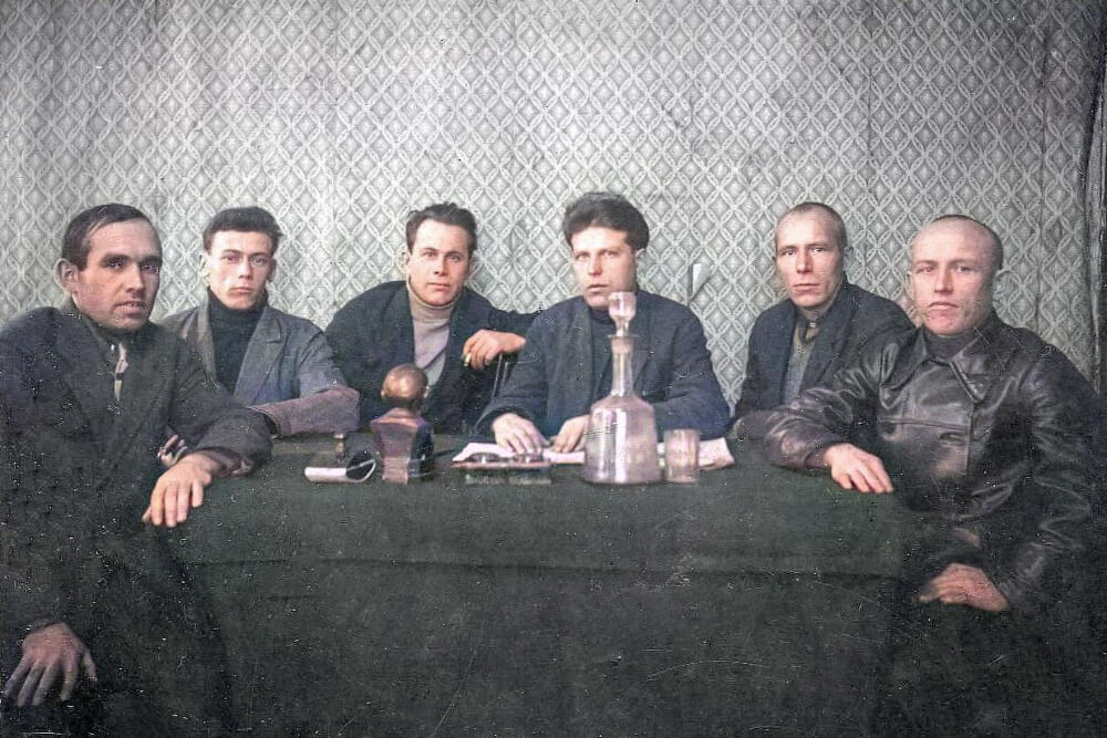 Группа внештатных пропагандистов парткома кожзавода ГУКОП: Марков Ф Н., Отопков Ф.Н., Карасев А.В., Язков, Девнин В.Н., Русинов Ф.П. Пропагандисты занимались разъяснением партийных документов и курса правительства среди рабочих завода в свободное от основной работы время. Автор фото неизвестен.