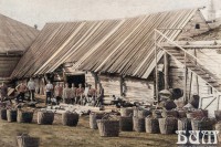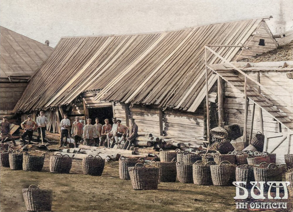 Покосившееся деревянное одноэтажное строение - кожевня со скатной крышей. На второй этаж ведет деревянная лестница с перилами. У основания строения лежат штабеля бревен и стоят большие плетеные корзины с отдубицей - измельченной дубовой корой. Автор неизвестен.