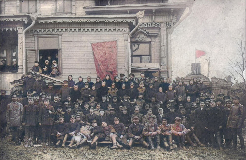 Рабочие завода сидят и стоят на улице на фоне деревянного здания с деревянной резьбой – конторы бывшего завода Хохлова Ивана Васильевича. На стене дома закреплен кумачовый стяг с революционным лозунгом и изображением шестеренки. В раскрытом окне слева две маленькие девочки с цветами в руках. В центре 1-го ряда сидит рабочий с красной лентой через плечо. На ленте надпись: «Герой Труда завода М.Русинов». В центре 2-ого ряда в черном пальто и шляпе – технический директор завода Хохлов Исаак Иванович – сын и совладелец бывшего заводчика Хохлова И.В. Рядом с ним слева в бушлате, фуражке сидит красный директор – Кубонин Владимир Иванович. Фото Лапкин Д.М.