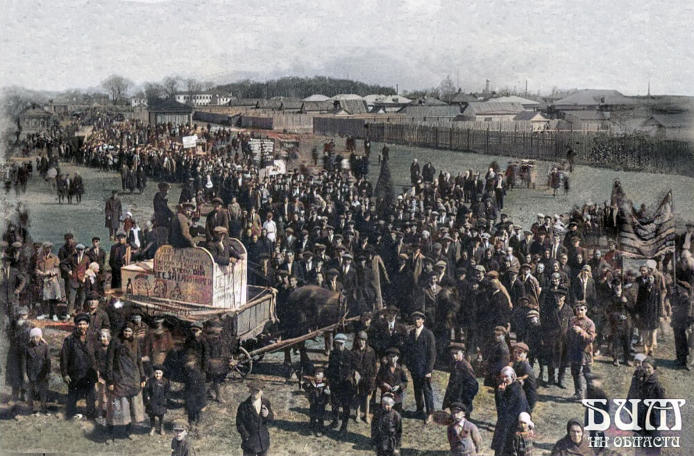 Фотограф Кокарев В.И. Многочисленная колонна людей с транспарантами у Крутой горы. На первом плане лошадь, запряженная в телегу. На телеге установлен деревянный балаган с надписью: БЮРОКРАТОВ, ЛОДЫРЕЙ,/ ХУЛИГАНОВ, ВРЕДИТЕЛЕЙ,/ ПАПУ РИМ.(СКОГО) и ФАШИСТОВ/ БЕЙ ПО ЧЕРЕПУ ОНИ/ ВСЕ ЗА КАПИТАЛИСТОВ!/