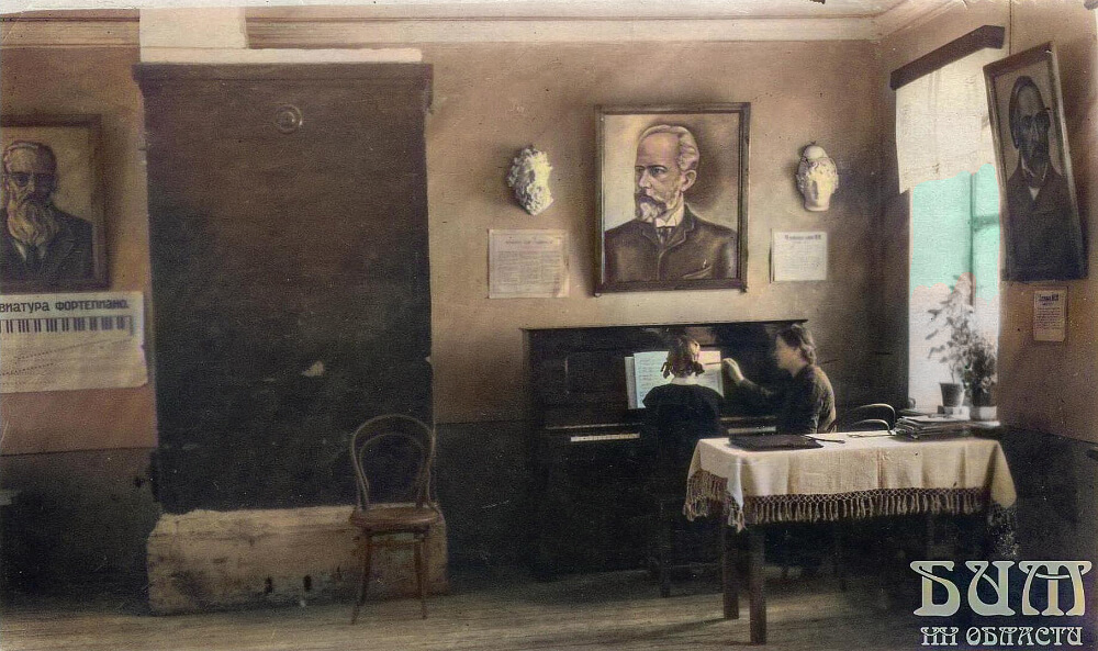 Занятия в музыкальном классе в Богородской школе №1, организованном учителем Рождественским Валентином Аркадьевичем. На стенах портреты композиторов, выполненные педагогом. 1939 г. Автор неизвестен.