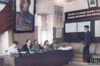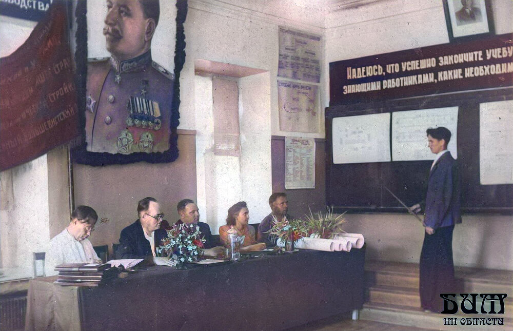 Аудитория кожтехникума с портретом И.В.Сталина в простенке между окон слева. Под портретом стол, покрытый скатертью. За ним сидят преподаватели во главе с директором Ломакиным В.А. (2-й слева) - члены экзаменационной комиссии. Справа стоит студент с указкой в руке, указывая на закрепленные на классной доске листы дипломной работы. Автор неизвестен.