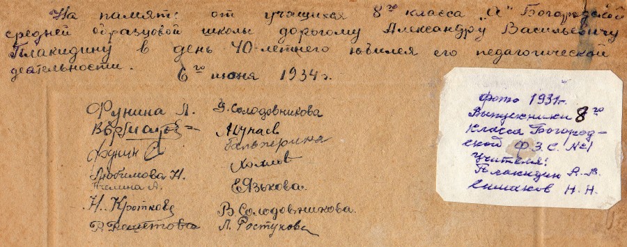 Выпускники 8-го класса Богородской средней образцовой школы №1 с учителями Плакидиным А.В. и Симаковым Н.Н. 1931 год. Автор неизвестен.