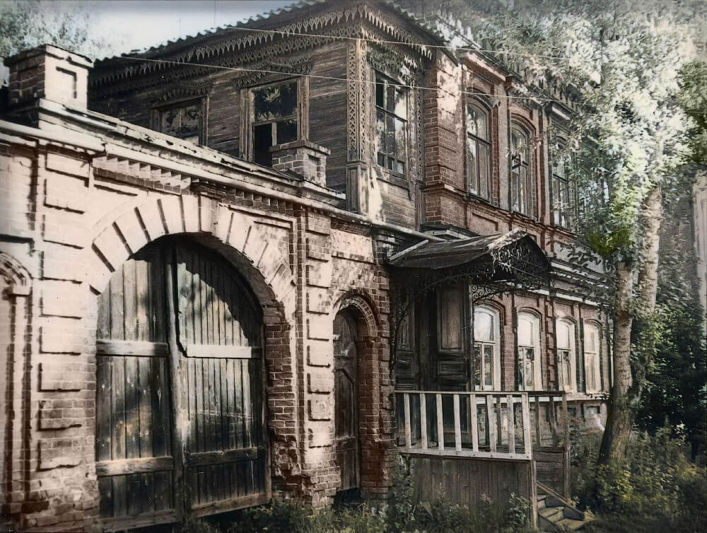 К. Маркса, №79. Здание отличается сложной композицией с центральным повышенным объемом и боковыми ассиметричными прирубами. Окна богато украшены наличниками и деталями с прорезной резьбой с растительными и геометрическими орнаментами. Мотивы резьбы напоминают мотивы народной вышивки: в резьбе объемных очелий треугольной формы использован декор в виде ягод земляники с листьями. По бокам от слухового окна размещены вертикальные прорезные доски, напоминающие полотенца с ажурным вышитым краем. Необычны угловые части фриза центрального объема, увенчанные небольшими фронтонами под двускатными кровлями; к ним подведены водоприемные воронки в верхней части украшенные художественной ковкой, в пластичной форме которых угадываются приметы стиля модерн.