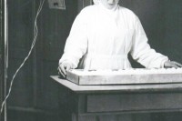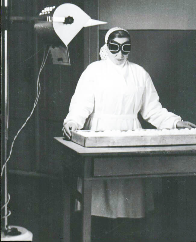 Бригадир Пурякова облучает цыплят в батарейном корпусе