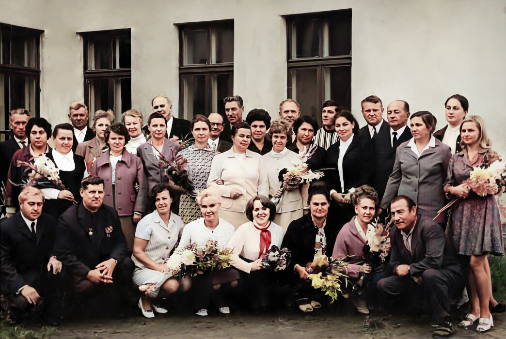 Странно, что Лисиченко на математике девятого класса. Наверное, на подмене. А на верхней фотке в заднем ряду не директор-ли четвёртой школы крайний слева, похож чем-то. Снимок восьмидесятых, третий ряд, третья справа похожа на ученицу из выпусков в семидесятых, ну не буду утверждать...