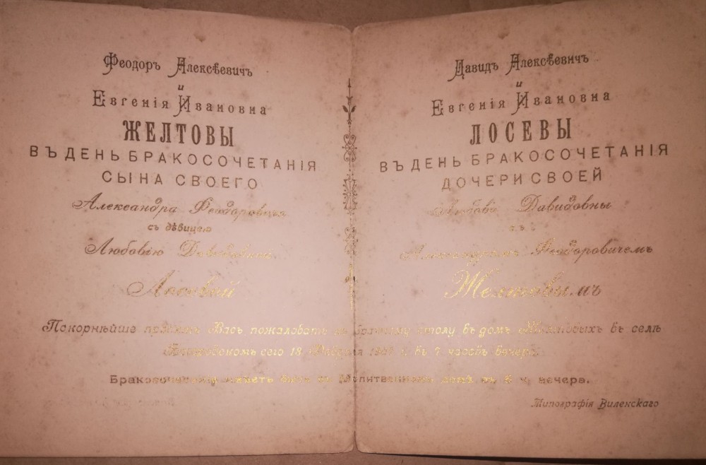 Приглашение на свадьбу Желтовых и Лосевых. Федор Алексеевич и Евгения Ивановна Желтовы в день бракосочетания сына своего Александра Федоровича с девицею Любовью Давидовной Лосевой. Давид Алексеевич и Евгения Ивановна Лосевы в день бракосочетания дочери своей Любови Давидовны с Александром Федоровичем Желтовым. Покорнейше просят Вас пожаловать к брачному столу в доме Желтовых в селе Богородском сего 18 февраля 1907 г. в 7 часов вечера. Бракосочетание имеет быть в Молитвенном доме в 6 ч. вечера.