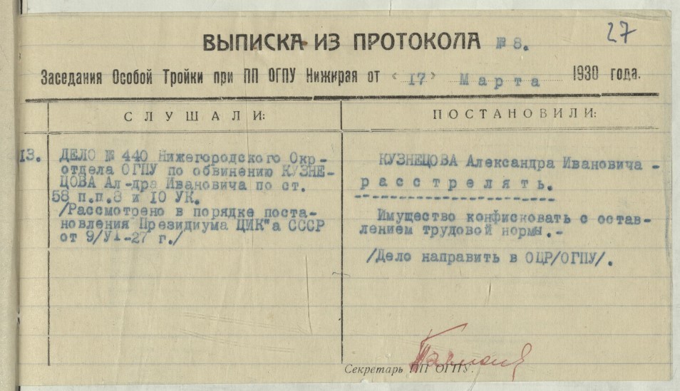 После этого полетели жалобы — в район, в область… Завертелась репрессивная машина. Итог — короткая запись на пожелтевшем клочке бумаги: приговор. А затем — общая могила на Бугровском кладбище в Нижнем Новгороде.