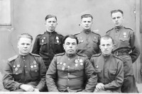 В центре уроженец с.Алешково комполка Герой Советского Союза подполковник Шубин В.А., справа начштаба полка майор Найденов, вверху комвзвода управления полка лейтенант Ушаков, помощник начштаба капитан Тычина, начсвязи полка капитан Скорик. Все участники Курской битвы, фото 1945 года.