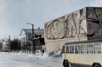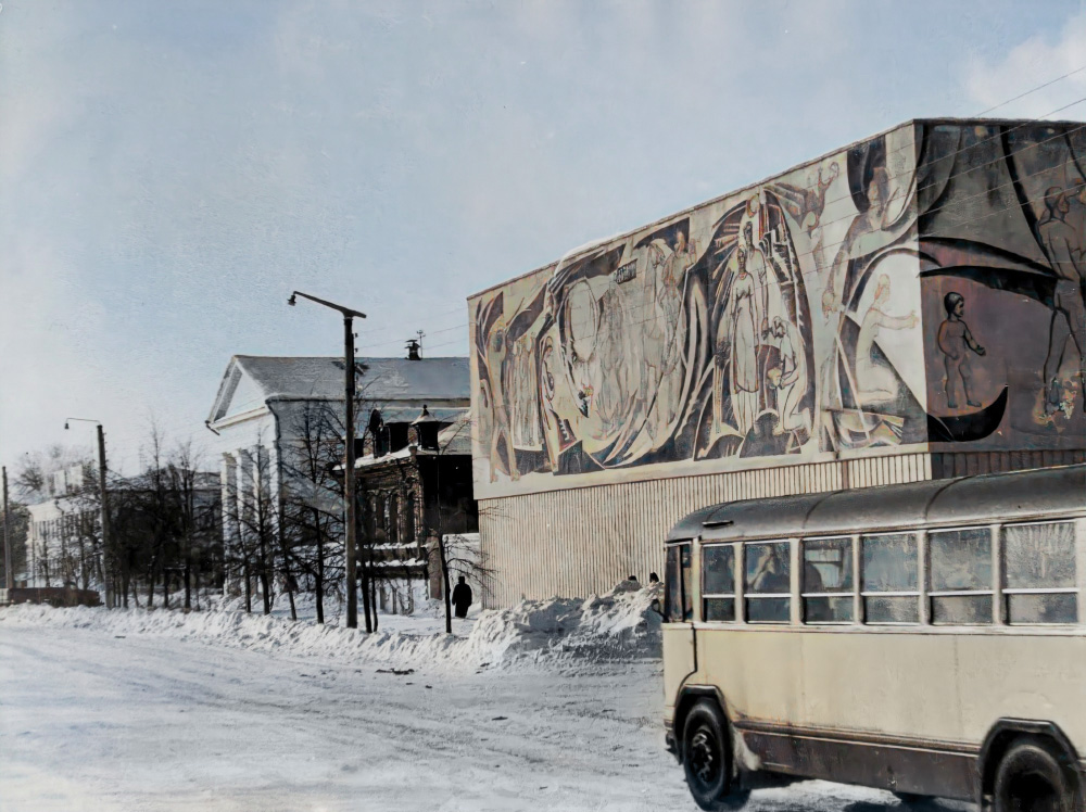 Интересно не кто снимал, а кто художник. Для 1970 года панно выглядит очень нестандартно и даже авангардно, такое вполне могли не понять в то время, со всеми вытекающими последствиями для автора. Убери древний автобус, так вообще как современный стрит-арт.