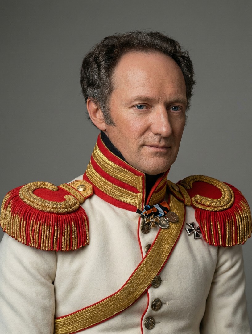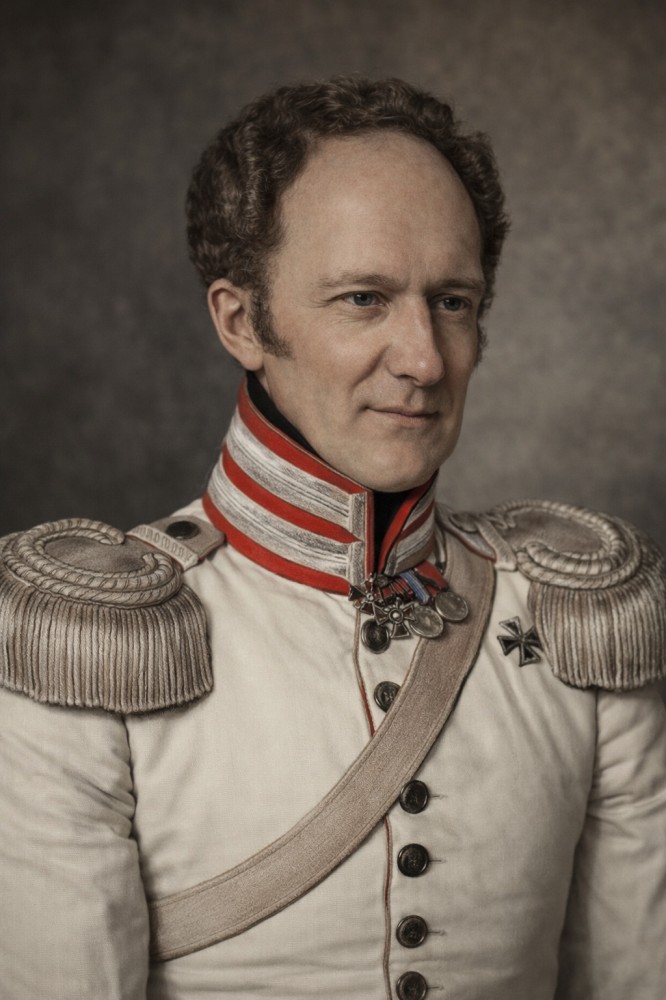 Кстати, долго думал, какого же цвета были погоны - серебристые или золотые. Вот тут полковник лейб-гвардии Конного полка Христофор Фёдорович Сольдаен на фото мундир точно такой же, как у полковника Шереметева с золотыми, а в фильме у полковника князя Болконского погоны серебристые. Вот и пойми тут нюансы, но то что они были полностью одного цвета это точно, промашка вышла))