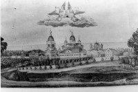 Это литография 1862 года...Некоему благочестивому дворянину Петру Глядкову приснились "видение и глас", что повелели ему на представленной горе "двинути храм во имя Пресвятыя Богородицы, чудотворныя ея иконы Владимирския". В светлую неделю, выйдя из дому по видению и гласу, увидел гору, словено именуемую, что показана была ему во сне. Пройдя лесом великим, узрел на ней "... огнь возгнещен... от него выспрь зрит столп вельми светел, достяжущ до небеси яки солнце...". Постигнув чудеса Преславной Божией Матери, он воспылал стремлением совершить храм сей...