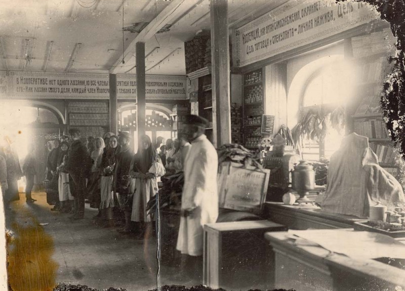 На плакате "прямо" написано: "В Кооперативе нет одного хозяина, но все члены Кооператива явпяются правоправными хозяевами его. Как хозяин своего дела каждый член Кооператива глубоко заинтересован в его правильной работе." На плакате "справа" написано: " Кооперация. как орган самоснабжения, охраняет----. Цель торговца и спекулянта - личная нажива.Цель К-----."