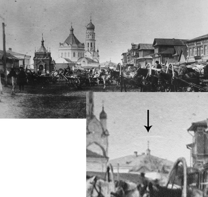 Хорошо ее видно на этой фото. НО! Это только больше доказывает, что церковь стояла дальше от нынешнего седьмого магазина (вдоль ул.Ленина). Бывшая церковь только малой частью стояла на территории нынешнего сквера.