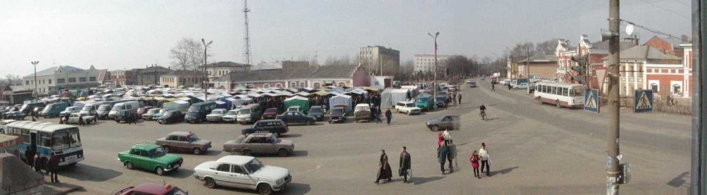 У меня хранится панорама с видом на центр, но с противоположной стороны, то есть со стороны администрации. На ней изображен магазин Гарант или это был ремонт телевизоров на том месте, где сейчас расположен Фараон, остановки ещё старые и Богородский Банк там со старым входом, с анфаса. Кто-то приносил в Фараон на трёх фотографиях, а в фотосалоне у Роговых изображения соединили и распечатали на плоттере.