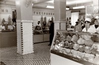 На этой фотографии уже прилавки ломятся от всяких вкусностей. А я помню этот магазин еще когда на полках и в витринах стояли банки с крабами ,а на прилавках лежала в маленьких судочках ржавая селедка. Тогда крабы были не деликатесной едой. Это был 57-58 год.А колбасы и в помине не было. И как мы живем сейчас., в сравнении.