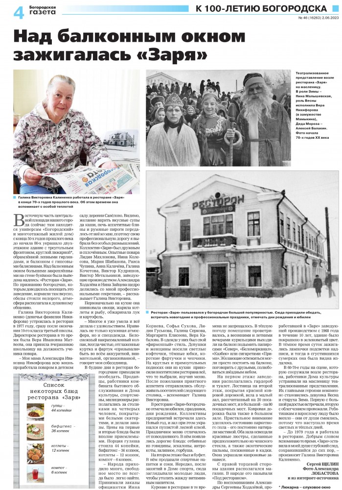 В «Богородской газете» №46 от 2 июня 2023 года в рубрике «к 100-летию Богородска» вышло интервью Сергея Щелина с Галиной Викторовной Калиненко о ресторане «Заря». Было упомянуто много имен и фамилий работников ресторана, в связи с этим хотелось бы дополнить статью несколькими снимками с работниками ресторана того времени, оставшиеся мне от моей мамы (И.Корневой), тоже работавшей там с 1967 года. Интервью по ссылке https://cloud.mail.ru/public/6W2m/nF1ihCYuj Фотографий интерьера увы нет.