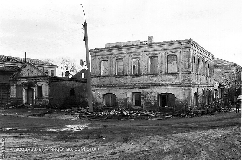 В мирное время -т.е. до этого погрома -в угловом здании на первом этаже была мясо-молоко- контрольная станция, на втором этаже жилые квартиры. Далее идет деревянный жилой дом.Далее двухэтажное кирпичное здание городской библиотеки, за зданием библиотеки -деревянное здание в нем в разное время были Гортоп,лесхоз.Левой стороны переулка не было.Был забор стадиона. Вправо от углового здания маленький магазинчик -в разное время торговал по разному... Вправо виднеется второй этаж ресторана "Заря".