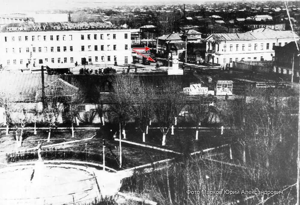 Сзади возвышается крыша дома, в котором сейчас "Магнит(исправлено)", ранее магазин № 7. Справа, под железной крышей, двухэтажное здание ресторана "Заря" (был такой), видны два окна.