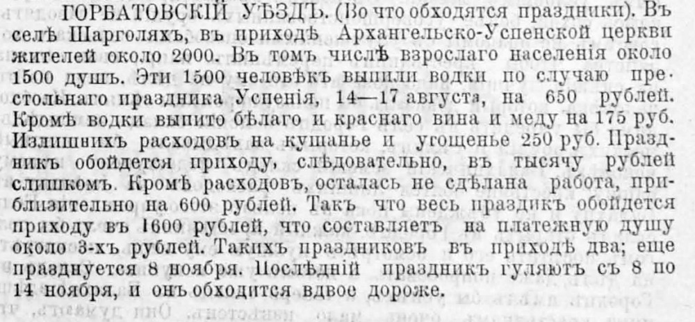 Архангельская церковь с. Шарголи построена в 1855 г. тщанием прихожан и посторонними жертвователями. Здание каменное, с таковою же колокольней, крепкое, для молящихся вместительное.