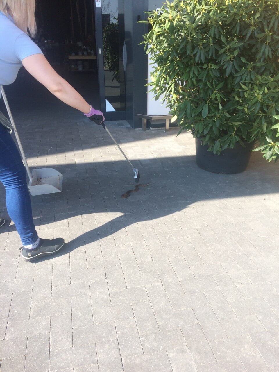 Уборщица заметает гадюку у входа в универсам. Сегодня.