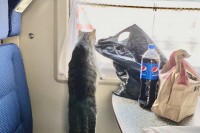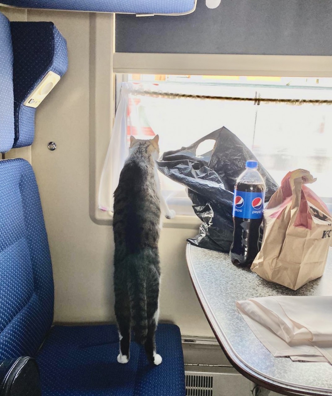 У нас кошка ехала с нами в поезде трое суток.С пересадками.В сумке.