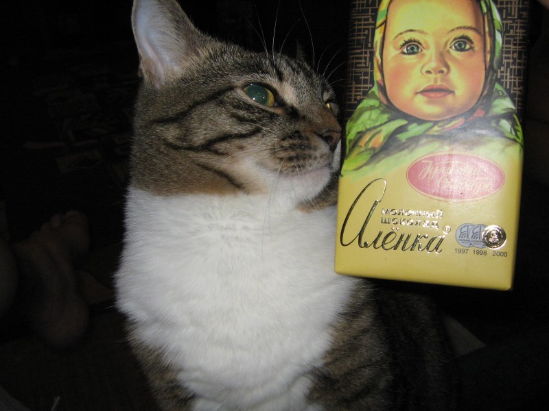 2) шоколадом его не угощают он тупо его ворует у нас (со стола, с сумок, из рук, и даже были попытки со рта-наглый ворюга)