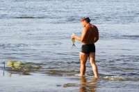 , да нет. Тут ему детки воду взбаламутили и он чуть отошёл с удочкой в сторонку. Там и поймал такую рыбину. Мы весь его улов засняли!