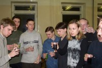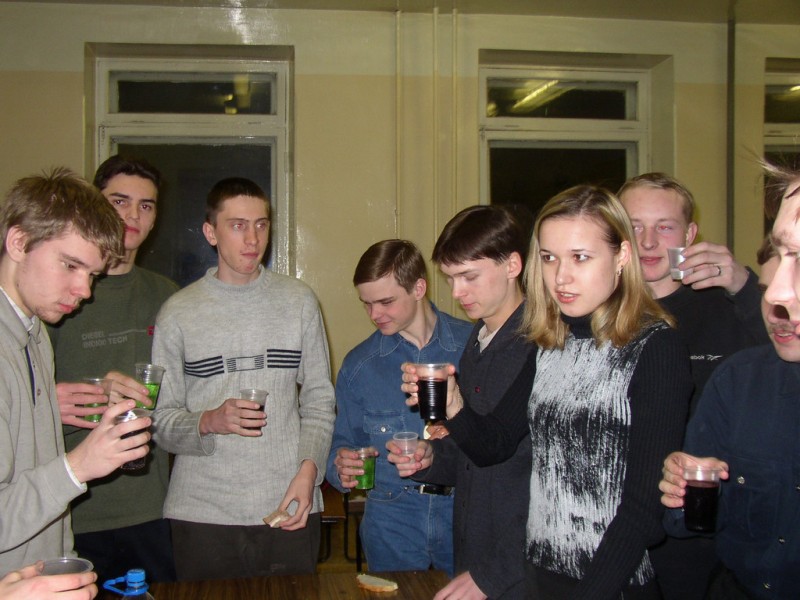 Ну кто вино, кто водку, кто тарзан. Это вроде бы было на 23 февраля, как раз после моего дня рождения. Мы тогда еще помню пошли пить к киоскам, купили еще водки, шоколадку и кириешек. Естественно, что потом все были в какашку.