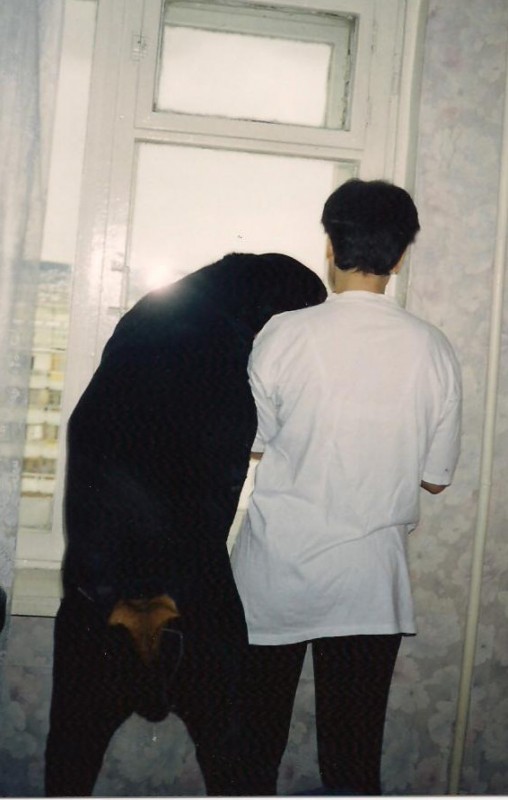 Я в маечке. Я - не оборотень! Собака действительно огромная весом в 97 кг. Этот ротвейлер доставил нам немало хлопот. Представляете, чего мне стоило его сдвинуть с места, когда он не хотел идти куда-либо?