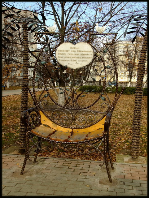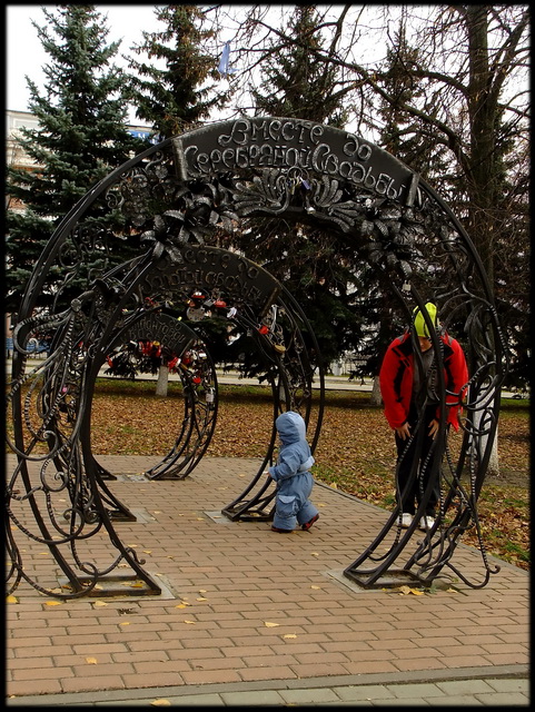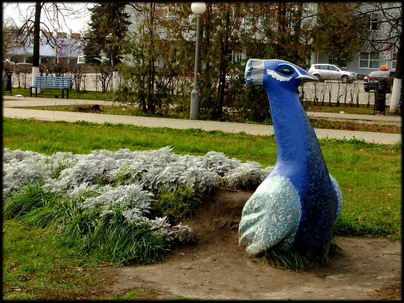 это площадь Дзержинского, ее еще называют Свадебной площадью. Рядом ЗАГС и все ходят сюда фотографироваться, поэтому год назад на площади появились новые скульптуры-сооружения. Это павлин, только не пойму какую роль он играет для молодоженов.