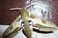 Этот красавец очень похож на винного бражника. В детстве у нас было увлечение на все лето: ловили гусениц, по энциклопедии определяли что за масти, оставляли их в банке с листьями, на которых их нашли; там они благополучно окукливались, а иногда даже в бабочек превращались Вот такой один раз вылупился.