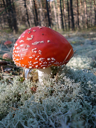 да..гриб страшно красивый))) А мох кажись Ягель называется, его олени кушают зимой...на севере.