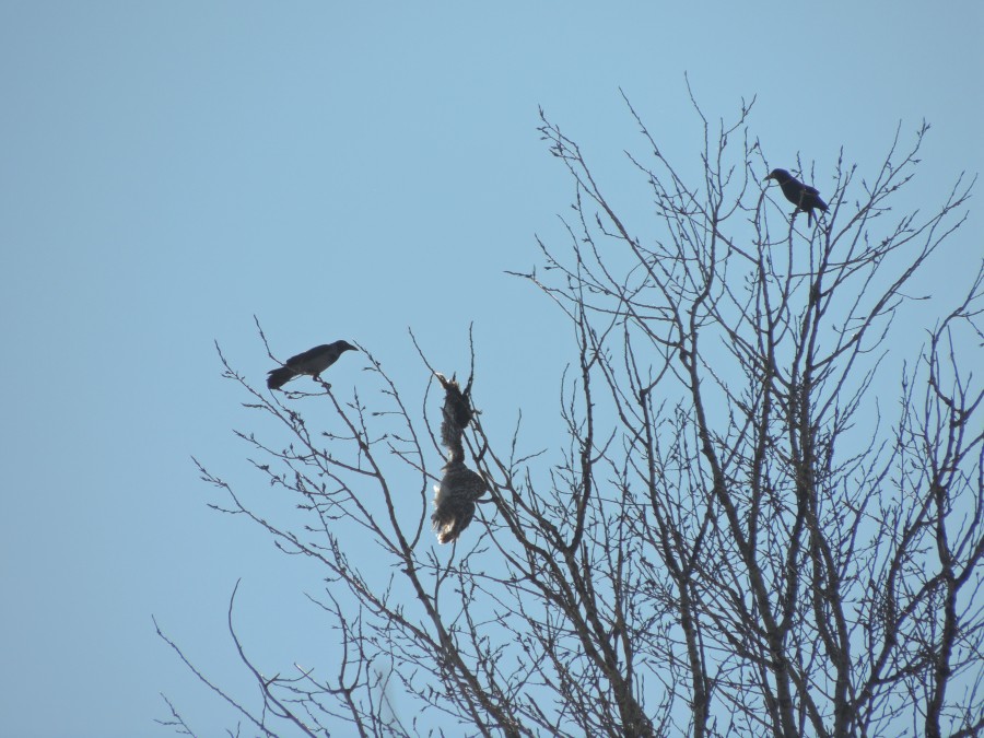 я как понял,что сова запуталась в ветвях(зацепилась крылом),а вороны её заклевали.жалко очень