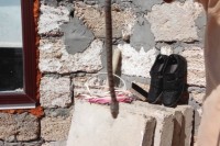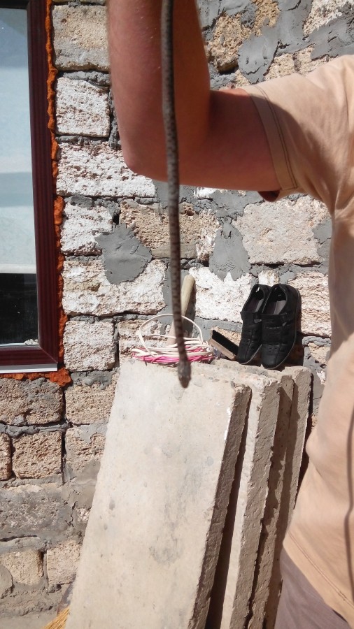 Я в фокусе провод вижу , обувь, щётка, черенок и все это на плитах.