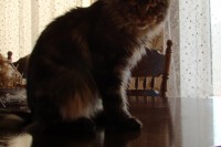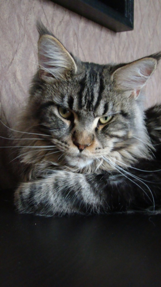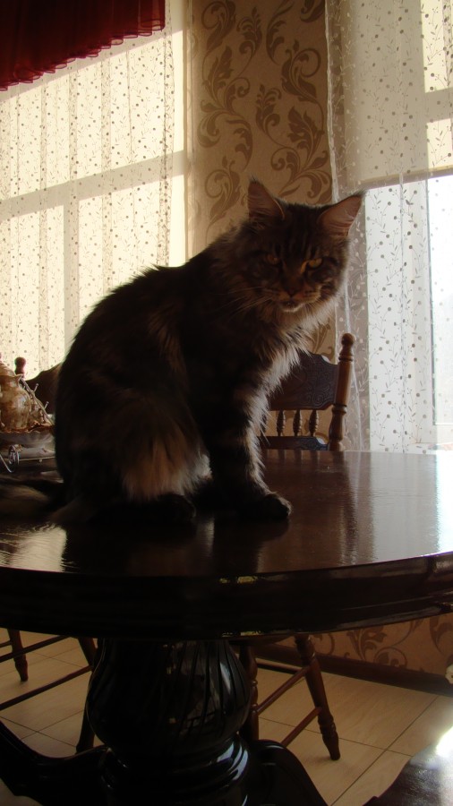 Кстати, могу развеять миф о том, что большие коты много едят. Неа, не много, и даже меньше, чем обычные. У него постоянно стоит сухой корм, иногда только просто досыпаю его в миску. То есть такой тенденции: сожрать всё! - нет. Кот всеяден (мороженое, каймак и йогурт очень любит) но и свои любимые лакомства съедает не более одной столовой ложки. Но самое его главное достоиство - он совершенно не шкодливый! И понимает слово "нельзя"