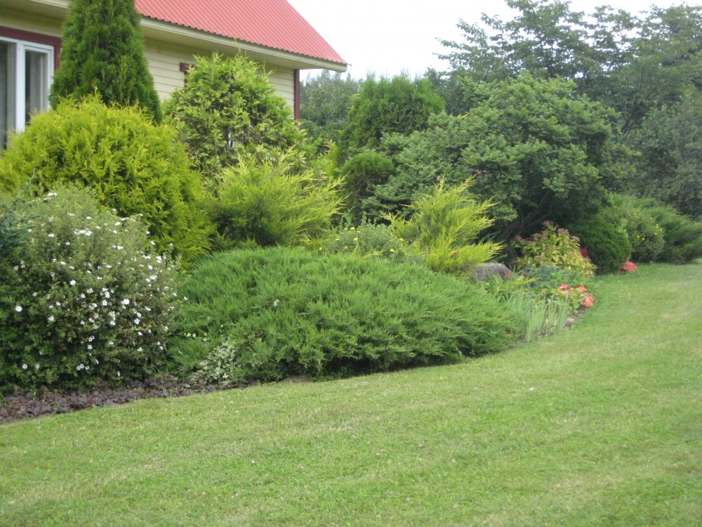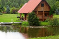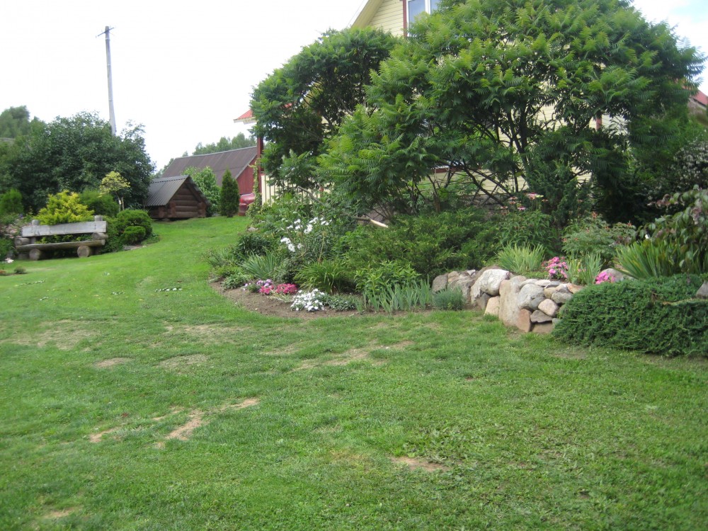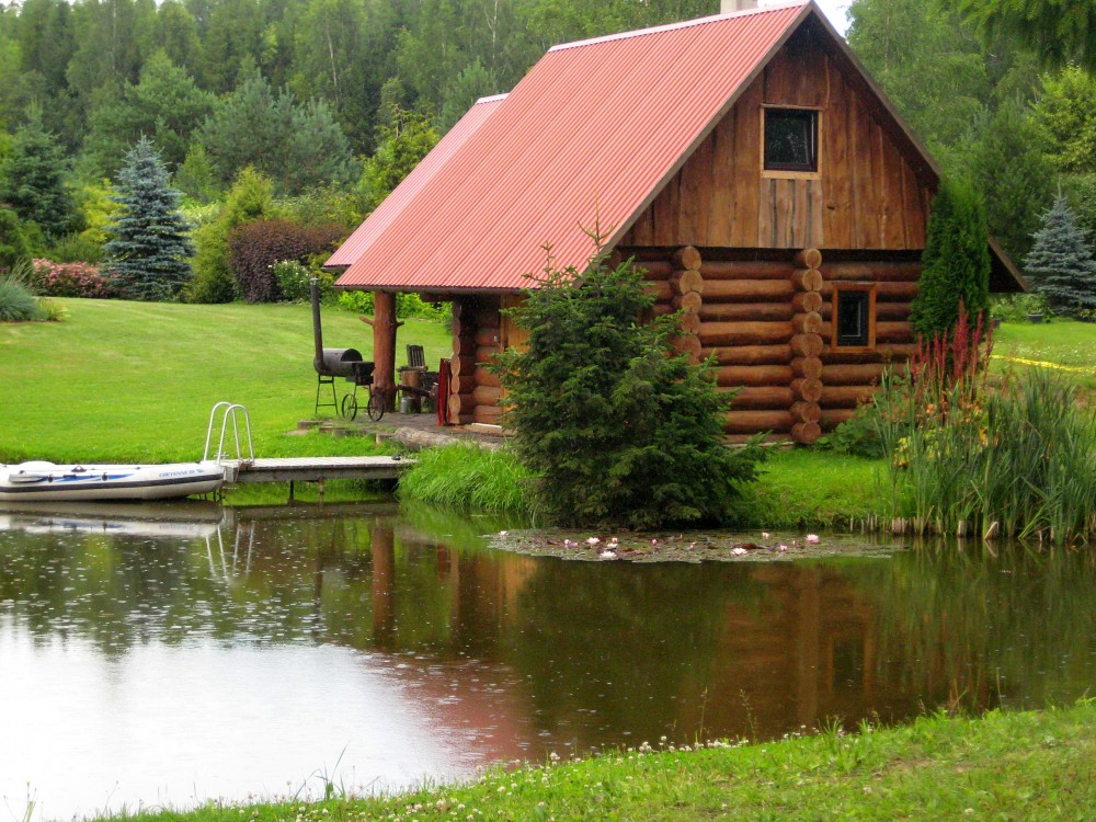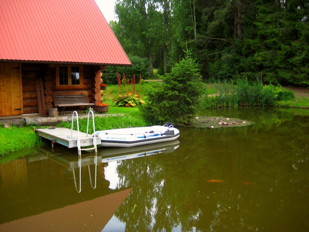 Та же банька. В воде виднеются спины рыбин. Хозяин баньки и запруды на ручье назвал их Valge Amur (Белый Амур). Рыба чистит прудик, чтобы не зарастал тиной и иной зеленью. Я видел, как рыбина наполовину высунулась на берег и выщипнула клок травы. Чтобы Амуры не спороли всё , что растёт, мужик сбрасывает в воду зелень, которую скашивает на лужайке своего участка.