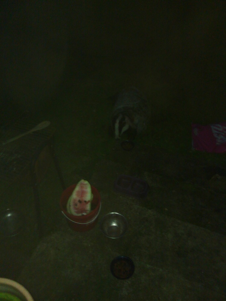 Сегодня мои кошки рванули все в дом и даже есть не стали. Зато через пяток минут из темноты нарисовалась вот эта образина. И нажралась так, что пузо до земли достаёт.