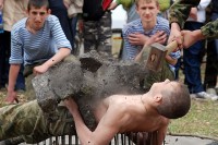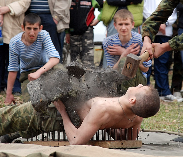 ударили молотком по пузу, а потом красный крест появился-лечить пузо.