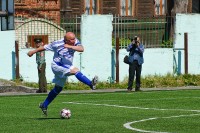 Длинная тень это от него, от мяча тень заканчивается у границы мяча. Высокое солнце, тень короткая, за счет длинного фокуса и большого растояния она трансформируется в перспективе в тонкую линию. Фигура человека перпендикулярна плоскости кадра, поэтому без искажений. Оптический обман, ёма! (Возьмите лист А4 и поглядите в торец. Что вы видите?) Если внимательней..