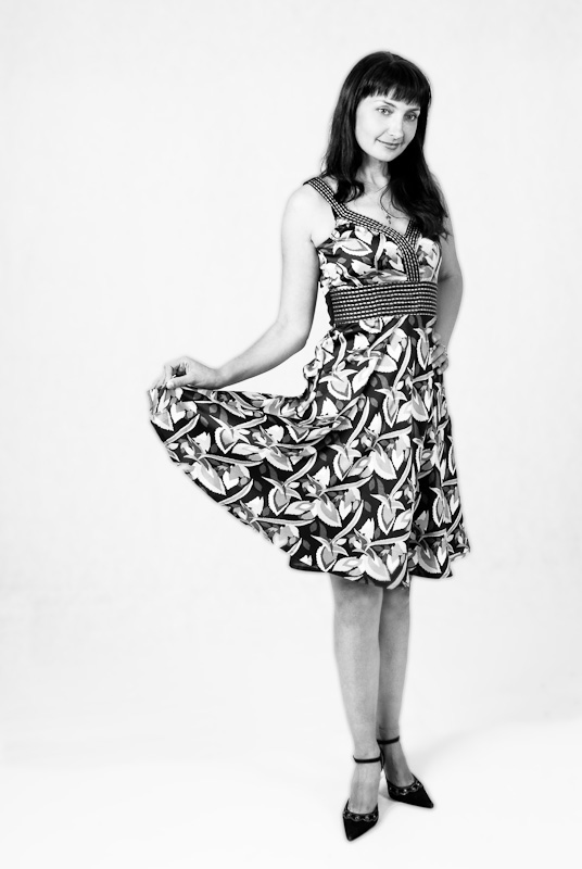 Коллеги! Мне кажется, что смысловой центр в кадре смещен необоснованно вправо: модель слишком близко к правому краю, а в центре совсем не она, как интересная девушка. В центре оказалась идея взмаха подола платья. Смести модель чуть левее, и тогда этот же взмах подола придаст больше игривости и некоторого озорства уже самой модели, а не платью. Мне так кажется. Насчет небольшого поворота влево - спорный вопрос. Тогда в большей степени возникнет проблема выразительности спины, плеч и груди: модель придется "ставить" по-другому, корректировать свет. Возможно, что в этом случае получится удачно, но придется дополнительно потрудиться.
