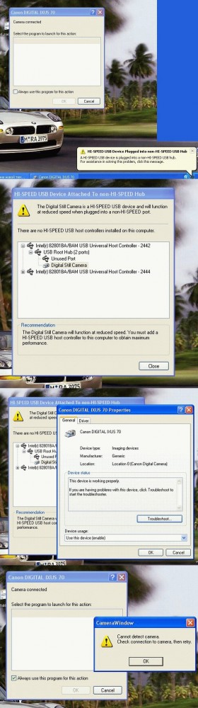 Первое, что вижу при соединении камеры с USB портом и её включении, это предупреждение о низкой скорости, а потом - вот все окна с кучу, блин, со старыми камерами проблем не было, на ноутбуке вообще сразу без всяких инсталированных дисков всё идёт в норме. |